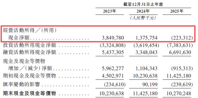 2023—2025年,华勤技术的营收分别为853.38亿元、1098.78亿元和1714.37亿元;同期的年内利润分别为26.57亿元、29.16亿元和41.32亿元。然而,与营收和利润规模持续扩大形成鲜明对比的是,其经营活动产生的现金流量净额却呈下行趋势。