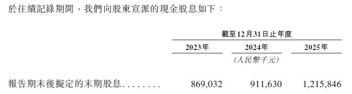 然而,在自身主营业务现金流由正转负、日常营运极度消耗资金的背景下,华勤技术却在赴港上市前夕宣派了逾12亿元的股息。招股书披露,公司于2026年3月宣派了截至2025年度的股息,总额达12.16亿元,该笔巨额款项将于2026年6月结清。整个报告期内,公司的现金分红力度一直居高不下。在2023年及2024年,公司宣派的末期股息分别达到了8.69亿元和9.12亿元。