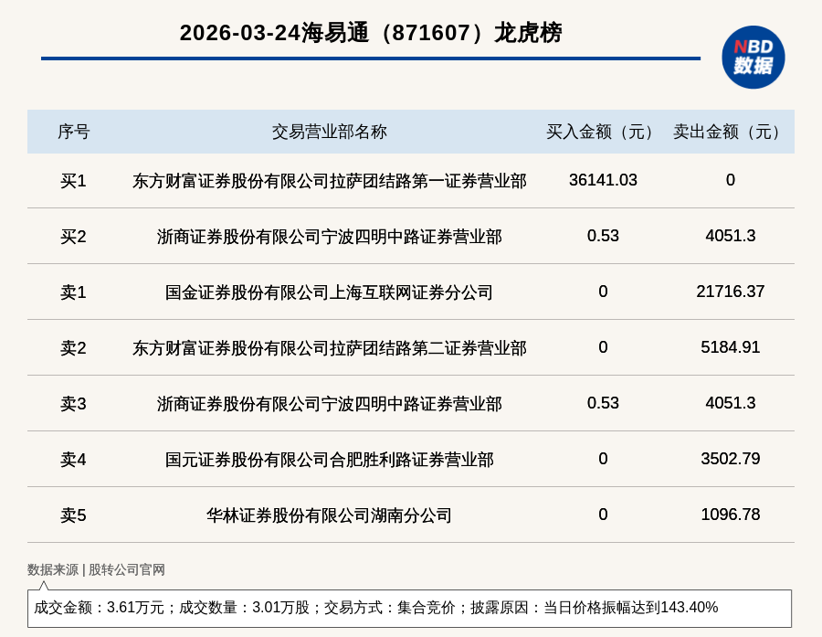 每经讯,2026年3月24日,新三板创新层公司海易通(871607,收盘价:0.53元)登上龙虎榜,交易方式是集合竞价,披露原因是当日价格振幅达到143.40%,成交数量3.01万股,成交金额3.61万元。买一席位为东方财富证券股份有限公司拉萨团结路第一证券营业部,买入3.61万元;卖一席位为国金证券股份有限公司上海互联网证券分公司,卖出2.17万元。