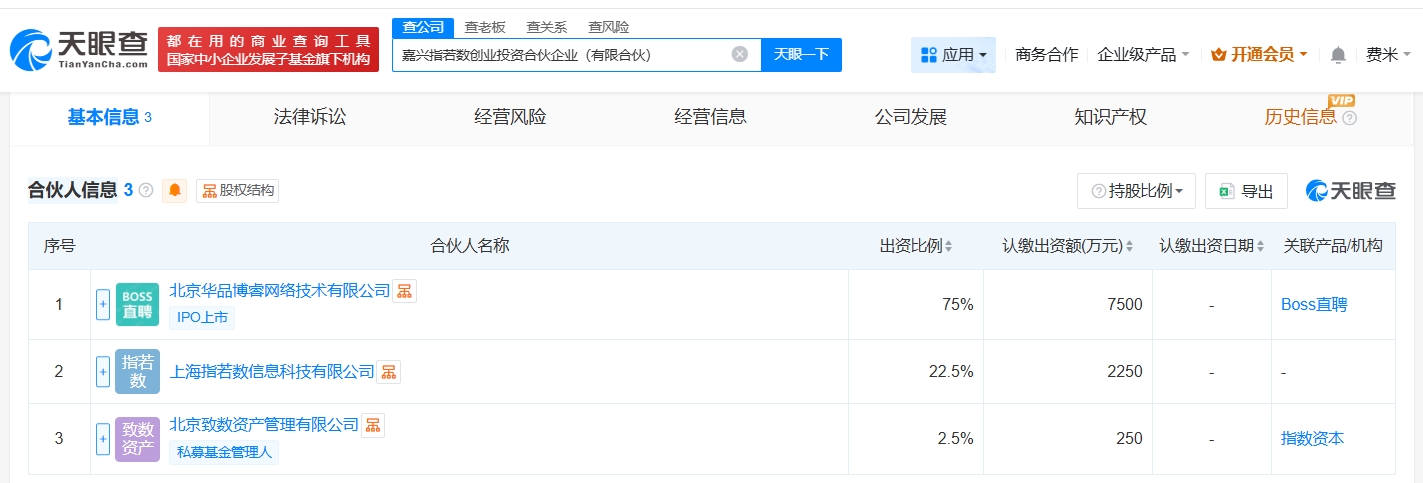 每经AI快讯,天眼查App显示,近日,嘉兴指若数创业投资合伙企业(有限合伙)成立,执行事务合伙人为北京致数资产管理有限公司,出资额1亿元人民币,经营范围为创业投资。合伙人信息显示,该合伙企业由Boss直聘关联公司北京华品博睿网络技术有限公司、上海指若数信息科技有限公司、北京致数资产管理有限公司共同出资。