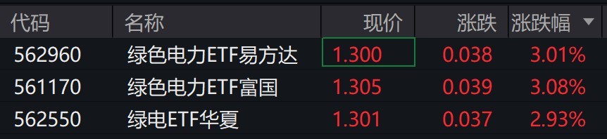 受盘面影响,绿色电力相关ETF涨约3%。