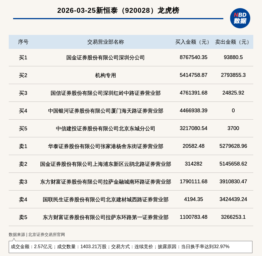 每经讯,2026年3月25日,北交所上市公司新恒泰(920028,收盘价:18.13元)登上龙虎榜,交易方式是连续竞价,披露原因是当日换手率达到32.97%,成交数量1403.21万股,成交金额2.57亿元。买一席位为国金证券股份有限公司深圳分公司,买入876.75万元;卖一席位为华泰证券股份有限公司张家港杨舍东街证券营业部,卖出527.96万元。