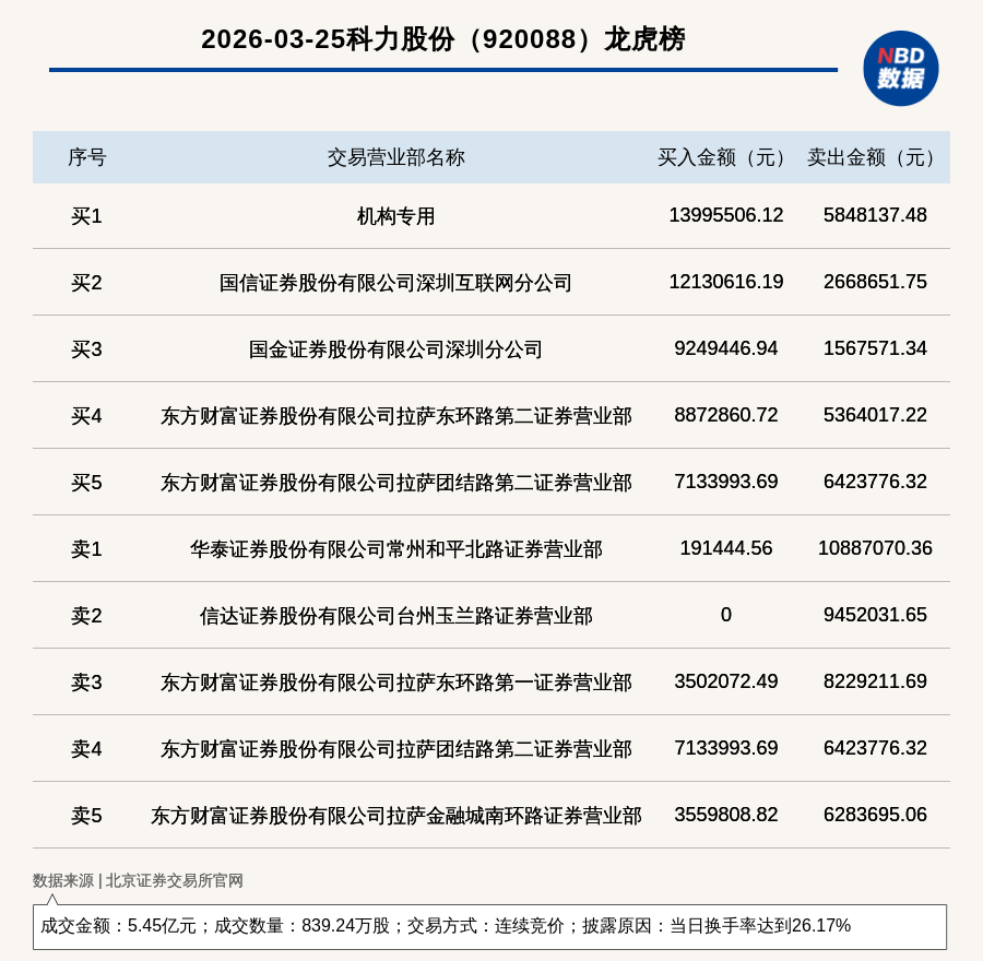 每经讯,2026年3月25日,北交所上市公司科力股份(920088,收盘价:65.69元)登上龙虎榜,交易方式是连续竞价,披露原因是当日换手率达到26.17%,成交数量839.24万股,成交金额5.45亿元。买一席位为机构专用,买入1399.55万元;卖一席位为华泰证券股份有限公司常州和平北路证券营业部,卖出1088.71万元。
