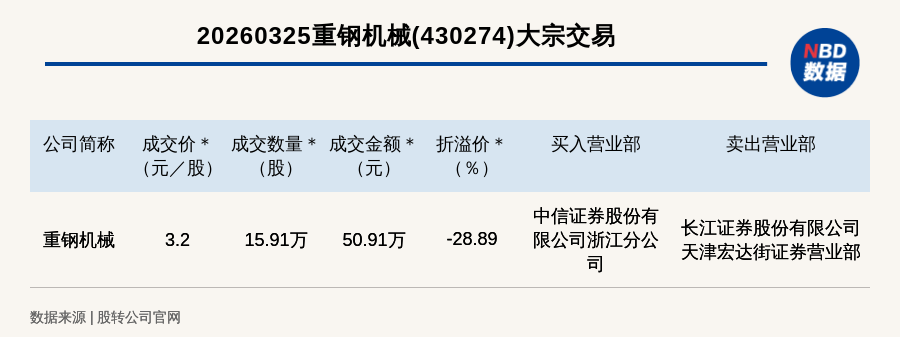 每经讯,2026年3月25日,新三板创新层公司重钢机械(430274,收盘价:4.5元)发生一笔大宗交易,成交价3.2元/股,成交数量15.91万股,成交金额50.91万元,折价28.89%。买入营业部是中信证券股份有限公司浙江分公司,卖出营业部是长江证券股份有限公司天津宏达街证券营业部。