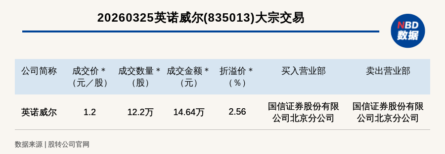 每经讯,2026年3月25日,新三板创新层公司英诺威尔(835013,收盘价:1.17元)发生一笔大宗交易,成交价1.2元/股,成交数量12.2万股,成交金额14.64万元,溢价2.56%。买入营业部是国信证券股份有限公司北京分公司,卖出营业部是国信证券股份有限公司北京分公司。