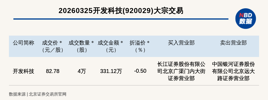 每经讯,2026年3月25日,北交所上市公司开发科技(920029,收盘价:83.2元)发生一笔大宗交易,成交价82.78元/股,成交数量4万股,成交金额331.12万元,折价0.5%。买入营业部是长江证券股份有限公司北京广渠门内大街证券营业部,卖出营业部是中国银河证券股份有限公司北京远大路证券营业部。
