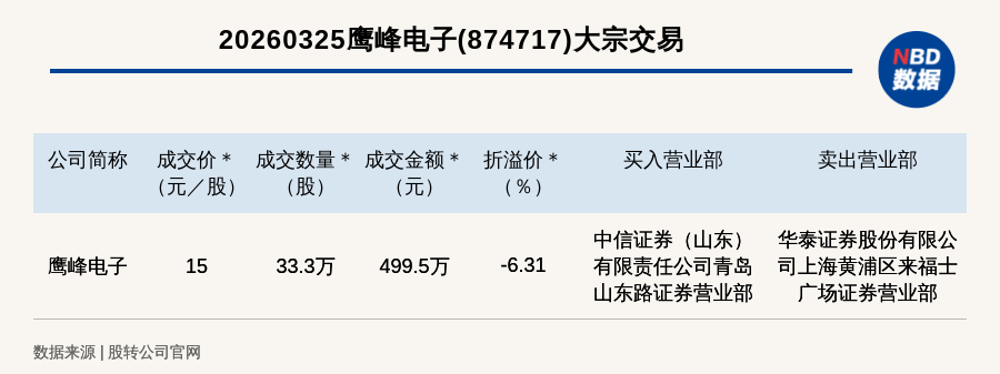 每经讯,2026年3月25日,新三板创新层公司鹰峰电子(874717,收盘价:16.01元)发生一笔大宗交易,成交价15元/股,成交数量33.3万股,成交金额499.5万元,折价6.31%。买入营业部是中信证券(山东)有限责任公司青岛山东路证券营业部,卖出营业部是华泰证券股份有限公司上海黄浦区来福士广场证券营业部。