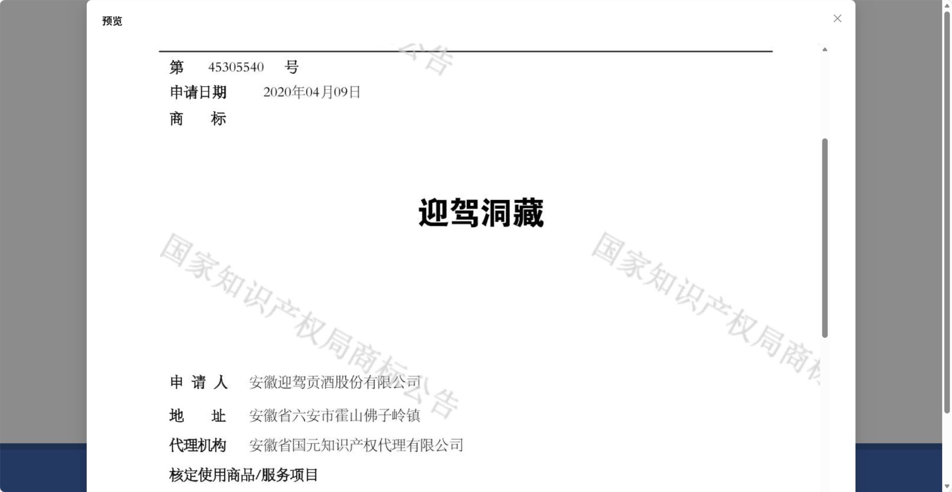 3月26日,每经记者在中国商标网查询到,目前,迎驾贡酒拥有“迎驾洞藏”“迎驾贡酒年份洞藏”等含有“洞藏”二字的商标。