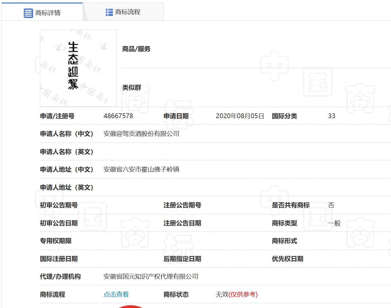 不过,“迎驾贡酒生态洞藏”商标状态是“无效”。2019年、2021年,迎驾贡酒两次申请均被驳回;此外,2020年,公司申请的“生态迎驾”商标也被驳回。