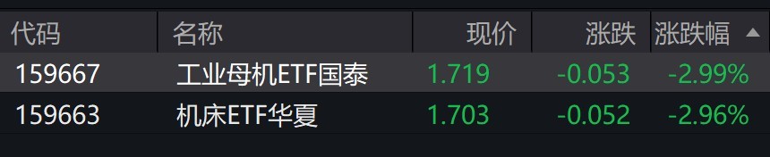 受盘面影响,工业母机ETF国泰、机床ETF华夏跌近3%。