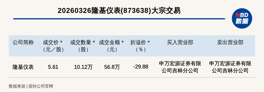 每经讯,2026年3月26日,新三板创新层公司隆基仪表(873638,收盘价:8元)发生一笔大宗交易,成交价5.61元/股,成交数量10.12万股,成交金额56.8万元,折价29.88%。买入营业部是申万宏源证券有限公司吉林分公司,卖出营业部是申万宏源证券有限公司吉林分公司。