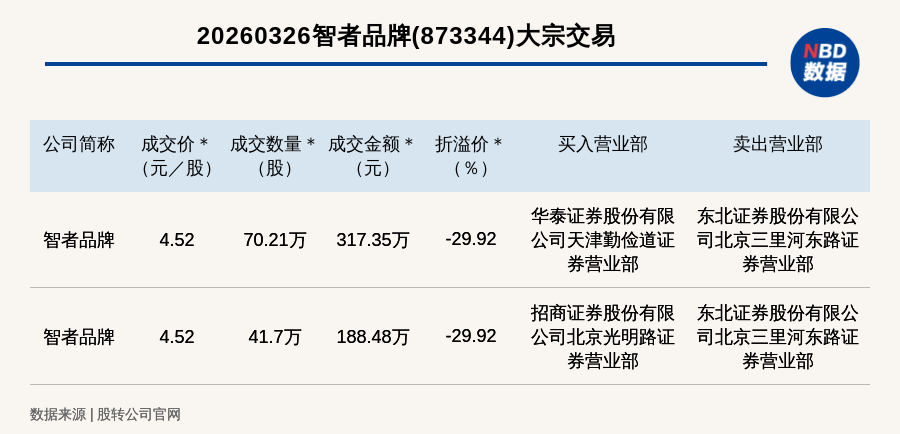 每经讯,2026年3月26日,新三板基础层公司智者品牌(873344,收盘价:6.45元)发生2笔大宗交易,总成交金额为505.83万元,成交金额最高的一笔成交价4.52元/股,成交数量70.21万股,成交金额317.35万元,折价29.92%。买入营业部是华泰证券股份有限公司天津勤俭道证券营业部,卖出营业部是东北证券股份有限公司北京三里河东路证券营业部。