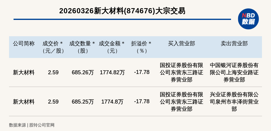 每经讯,2026年3月26日,新三板基础层公司新大材料(874676,收盘价:3.15元)发生2笔大宗交易,总成交金额为3549.62万元,成交金额最高的一笔成交价2.59元/股,成交数量685.26万股,成交金额1774.82万元,折价17.78%。买入营业部是国投证券股份有限公司东营东三路证券营业部,卖出营业部是中国银河证券股份有限公司上海安业路证券营业部。