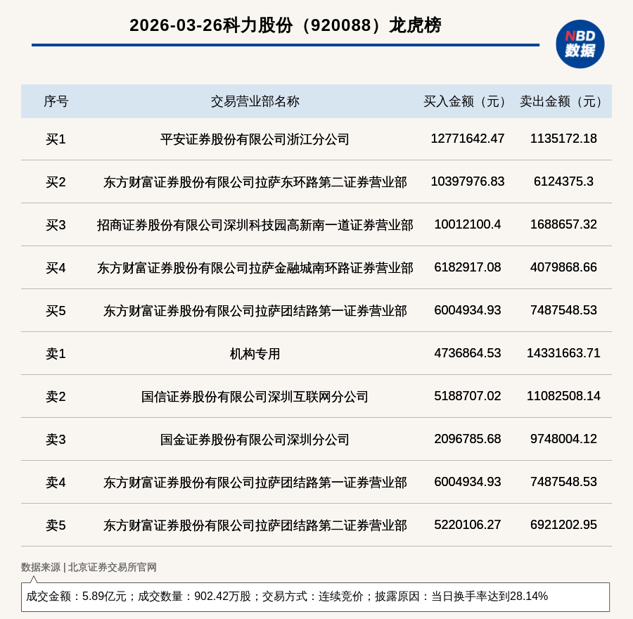 每经讯,2026年3月26日,北交所上市公司科力股份(920088,收盘价:65.66元)登上龙虎榜,交易方式是连续竞价,披露原因是当日换手率达到28.14%,成交数量902.42万股,成交金额5.89亿元。买一席位为平安证券股份有限公司浙江分公司,买入1277.16万元;卖一席位为机构专用,卖出1433.17万元。