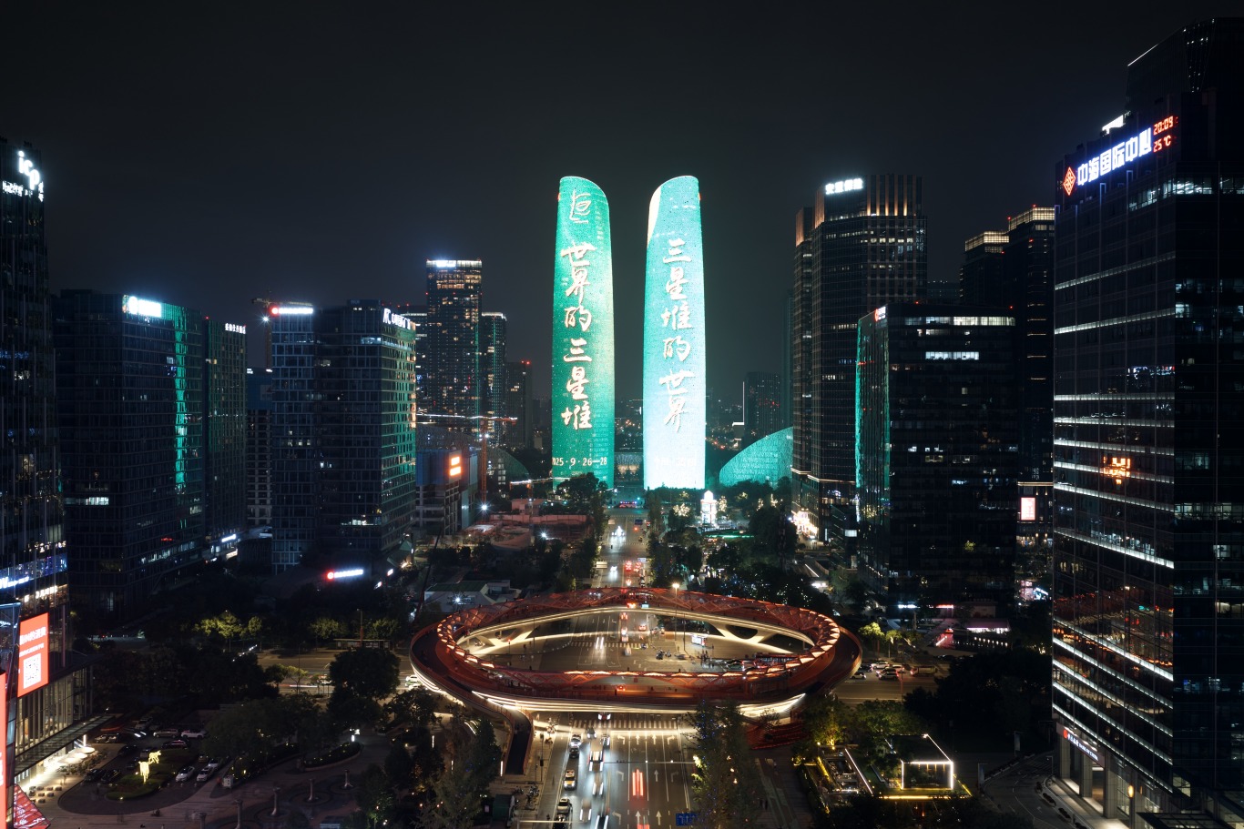 三星堆论坛期间,三星堆元素点亮成都双子塔。广汉融媒体供图。