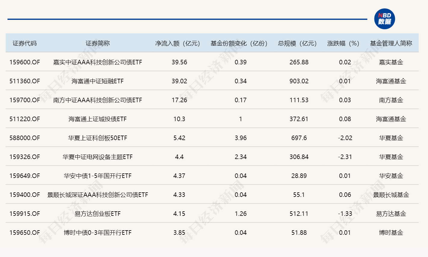 Wind数据显示,在3月26日的非货币ETF市场中,嘉实中证AAA科技创新公司债ETF基金份额增加0.39亿份,净流入额39.56亿元;海富通中证短融ETF基金份额增加0.34亿份,净流入额39.02亿元;南方中证AAA科技创新公司债ETF基金份额增加0.17亿份,净流入额17.26亿元。