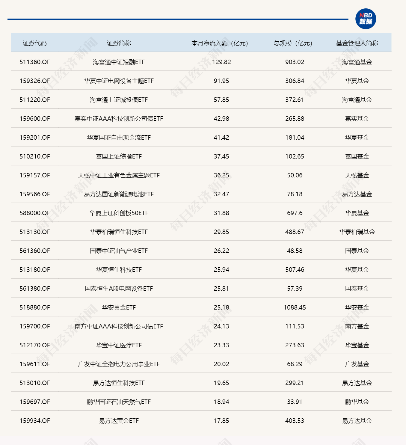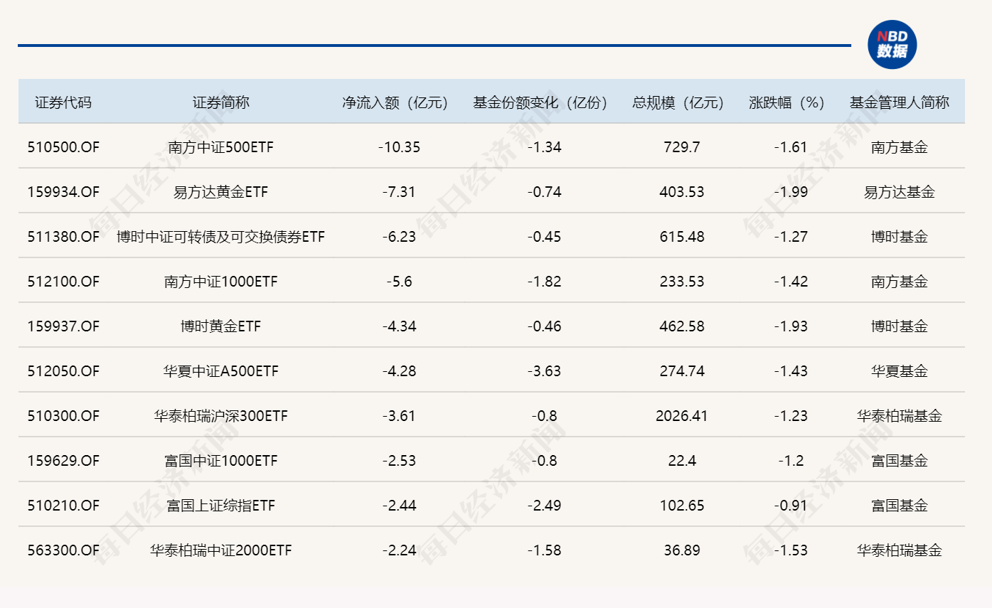 与此同时,南方中证500ETF基金份额减少1.34亿份,净流出额10.35亿元;易方达黄金ETF基金份额减少0.74亿份,净流出额7.31亿元;博时中证可转债及可交换债券ETF基金份额减少0.45亿份,净流出额6.23亿元。