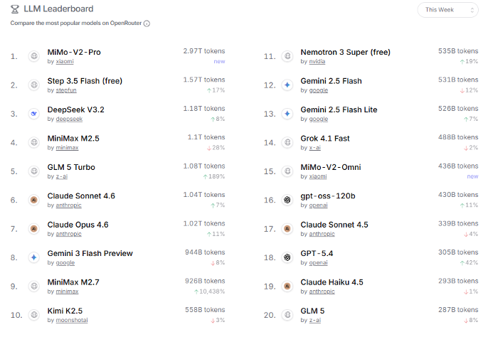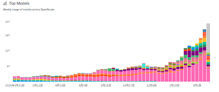 从Tokens角度看,近两周该平台上Tokens调用量明显增长,出乎意料的是小米Deepseek、Minimax等国产厂商的模型赫然在前十之列。显而易见,国产模型相对海外先进大模型尽管在性能上略有参差,但中国电力等能源价格相对便宜,输出的近期Tokens性价比较高,对于海外部分对成本敏感的客户有较强的吸引力。Tokens出海约等于电力出海的说法,也有一定的道理。