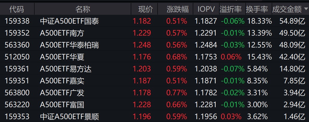 截至上午收盘,场内跟踪中证A500指数的ETF小幅上涨。其中,有9只中证A500相关ETF成交额超1亿元,2只超49亿元。中证A500ETF国泰、A500ETF南方早盘成交额分别为54.89亿元、49.5亿元。