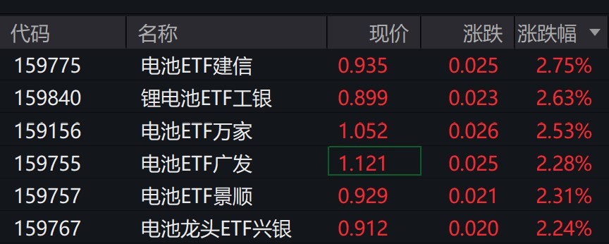 受盘面影响,电池相关ETF涨超2%。