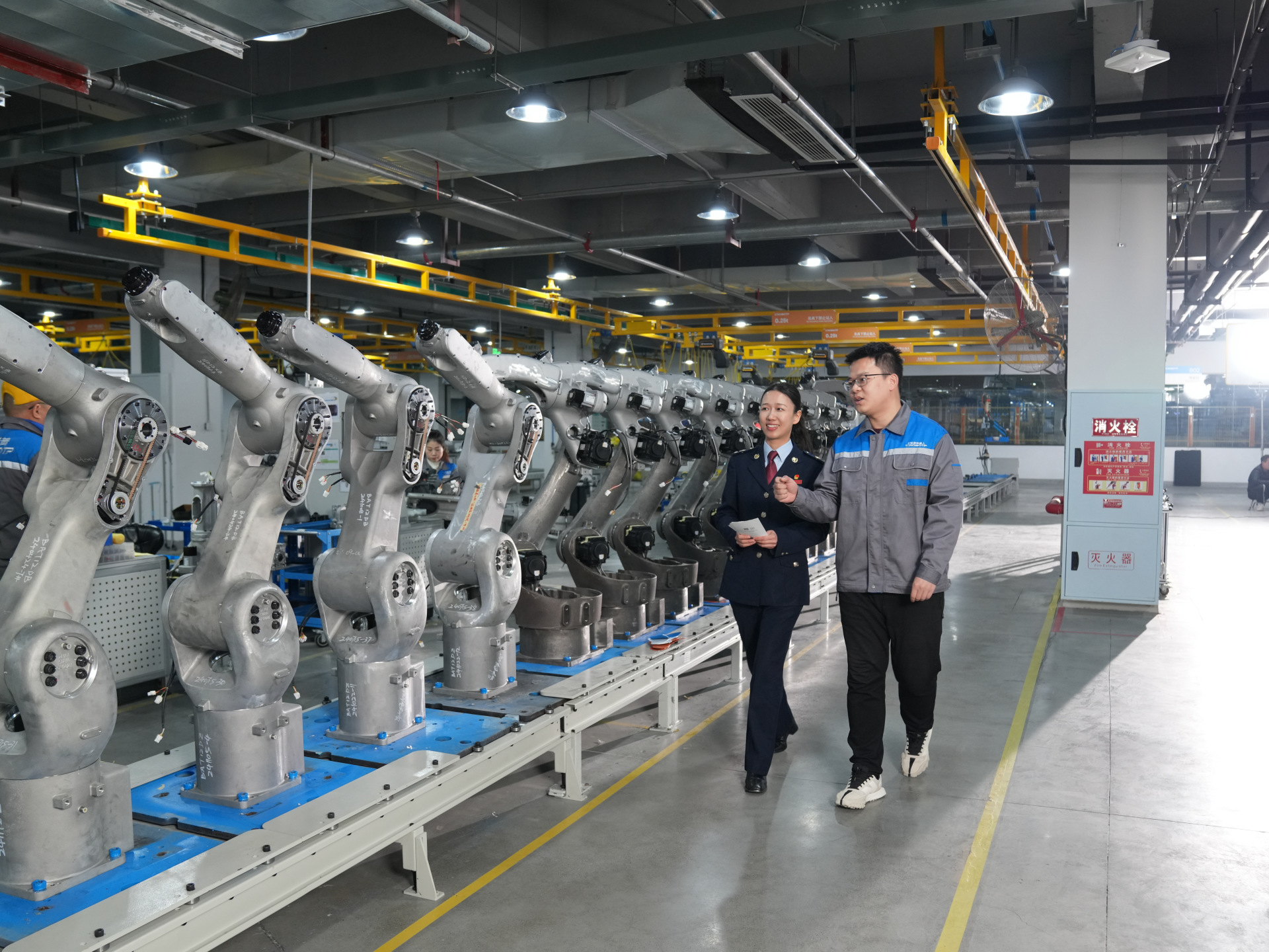 税务干部走进成都卡诺普机器人技术股份有限公司生产线了解企业生产经营详情,听取涉税需求并同步开展政策宣传辅导。 图片来源:成都市税务局