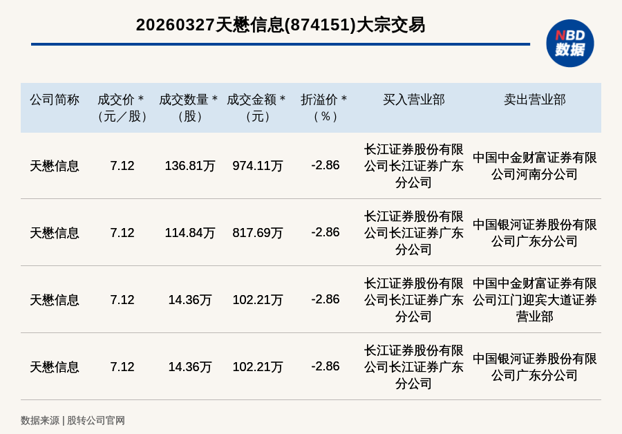 每经讯,2026年3月27日,新三板创新层公司天懋信息(874151,收盘价:7.33元)发生4笔大宗交易,总成交金额为1996.23万元,成交金额最高的一笔成交价7.12元/股,成交数量136.81万股,成交金额974.11万元,折价2.86%。买入营业部是长江证券股份有限公司长江证券广东分公司,卖出营业部是中国中金财富证券有限公司河南分公司。