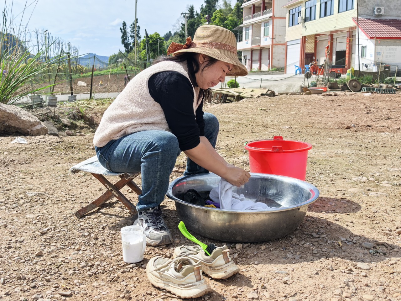 杨冬梅在搓洗衣物。