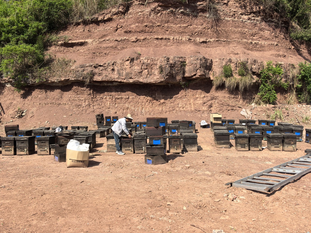 卧佛镇卧佛村一处山坡下,150多个黑色蜂箱整齐排列,蜜蜂穿梭其间,嗡嗡声不绝于耳。不远处,一个钢材搭建的简易板房就是陈继夫妇的家——锅碗瓢盆、煤气灶、冰箱、床,一应俱全。