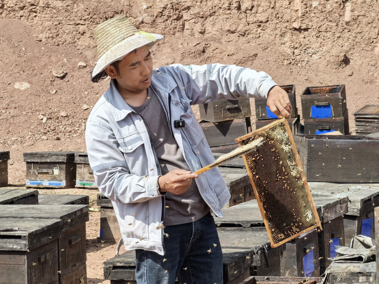 她和丈夫一起给合作社养蜂,每人每月固定工资六千元,年底还有分红。每年五月,她跟着蜂群出发,辗转甘肃、新疆,到十一月才回来。