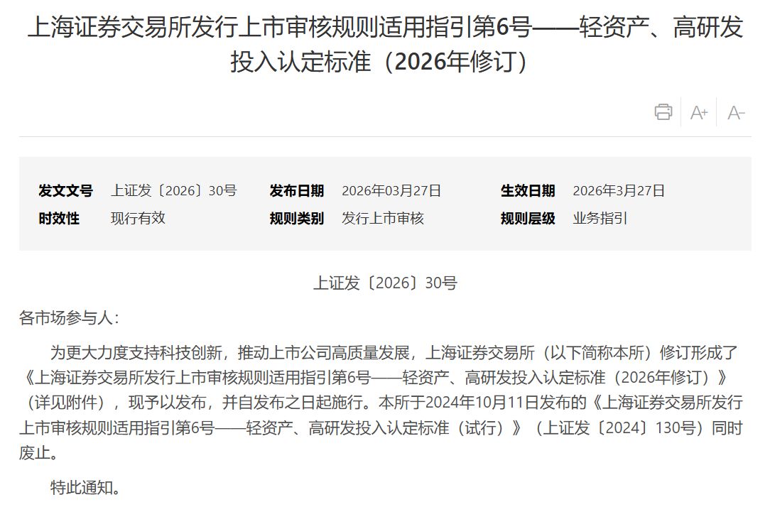 今日,上交所发布了新修订的《上海证券交易所发行上市审核规则适用指引第6号——轻资产、高研发投入认定标准》(以下简称《6号指引》)。
