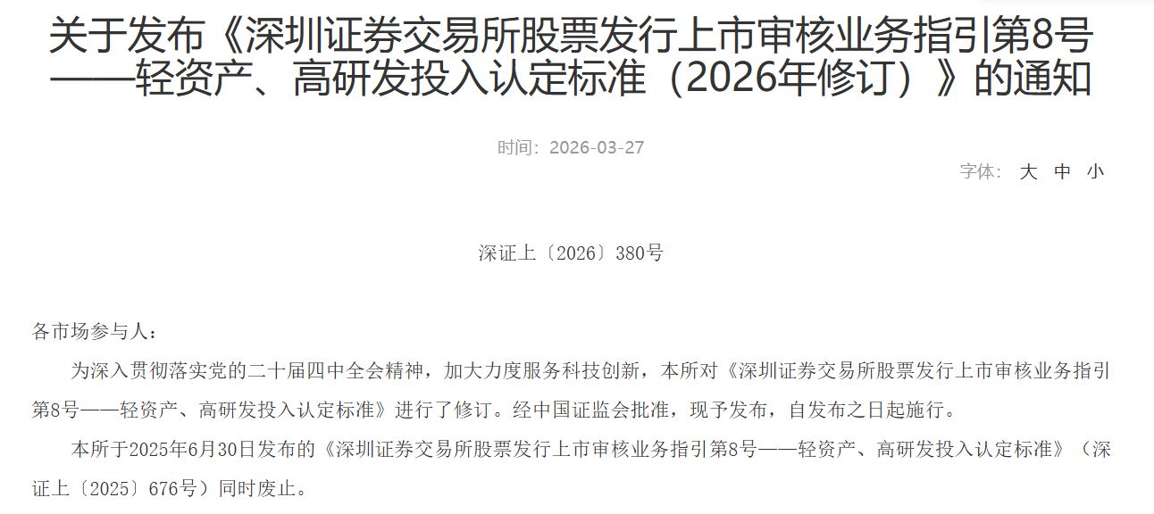 3月27日,沪深交易所官网发布新修订的“轻资产、高研发投入”认定标准,明确主板“轻资产”认定标准为实物资产占总资产比重不高于20%,“高研发投入”认定标准为最近三年平均研发投入占比不低于15%等。新修订旨在提升再融资灵活性,支持科技创新,为轻资产科创类企业提供便利,打破板块制度壁垒,加速“科技—产业—金融”循环。