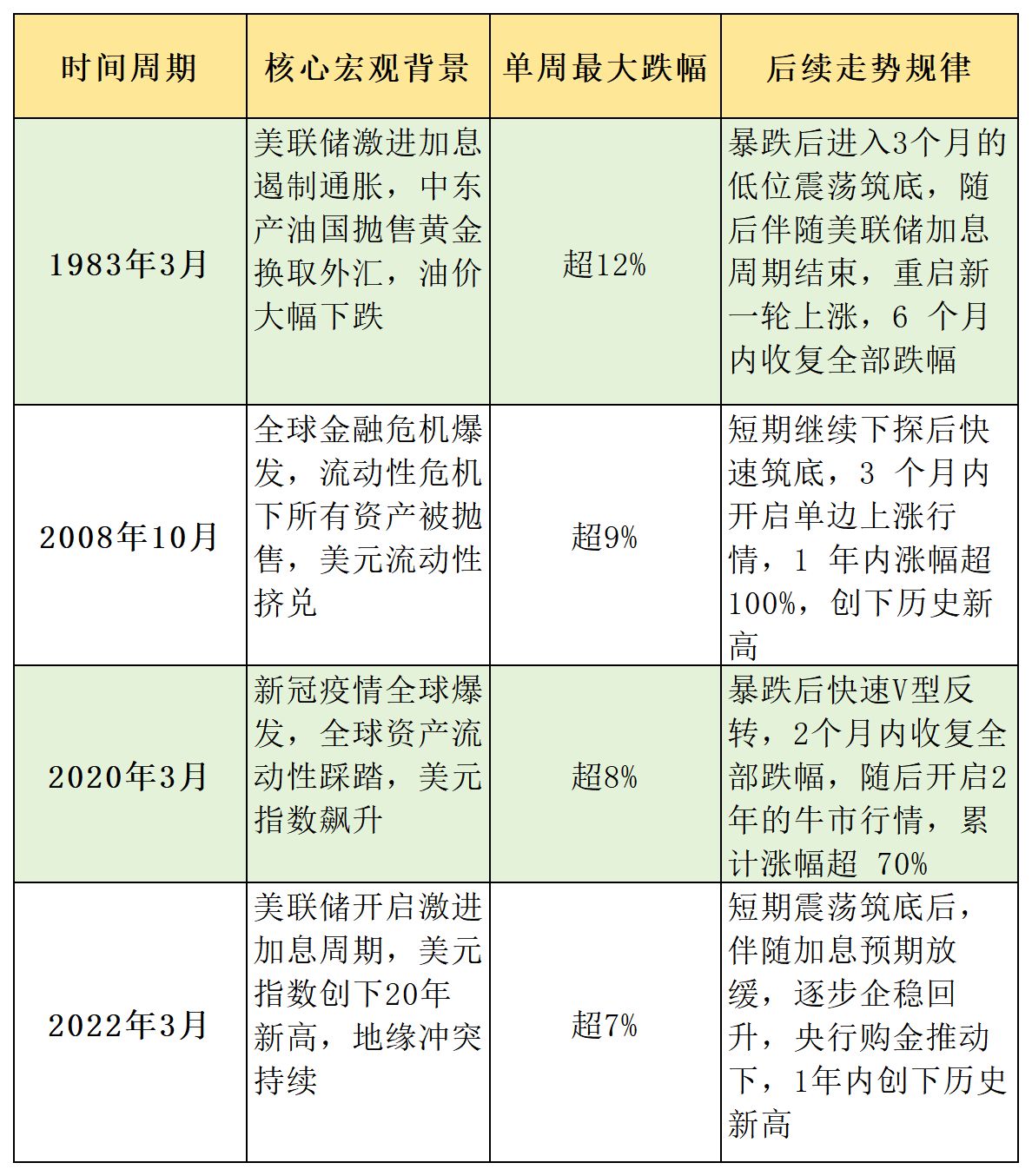 《每日经济新闻》记者选取了与本次黄金行情具备可比性的四轮极端下跌周期,核心特征与后续走势如下: