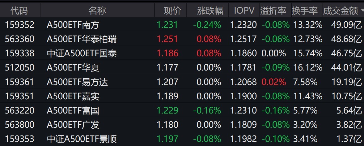截至上午收盘,场内跟踪中证A500指数的ETF涨跌不一。其中,有9只中证A500相关ETF成交额超1亿元,2只超48亿元。A500ETF南方、A500ETF华泰柏瑞早盘成交额分别为49.09亿元、48.68亿元。