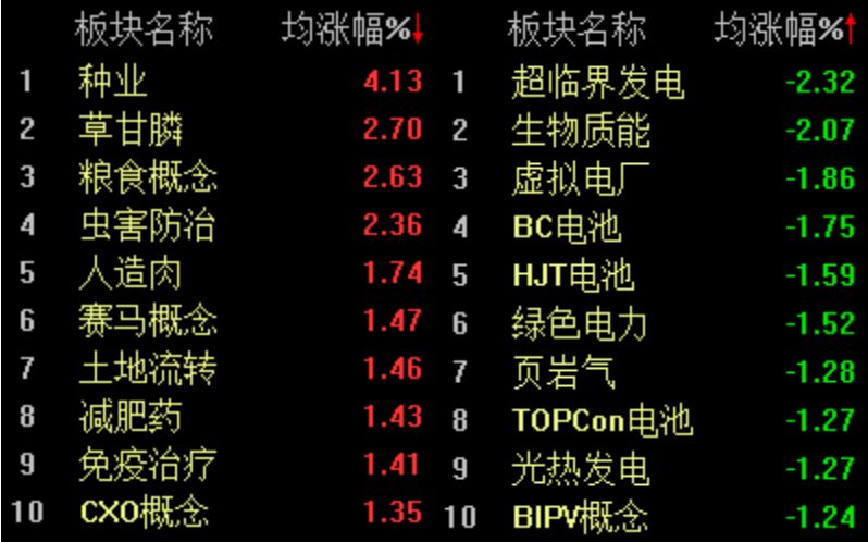 板块方面,种植业、草甘膦、贵金属、工业金属涨幅居前,电力、公用事业、光伏设备、虚拟电厂表现不佳,领跌市场。