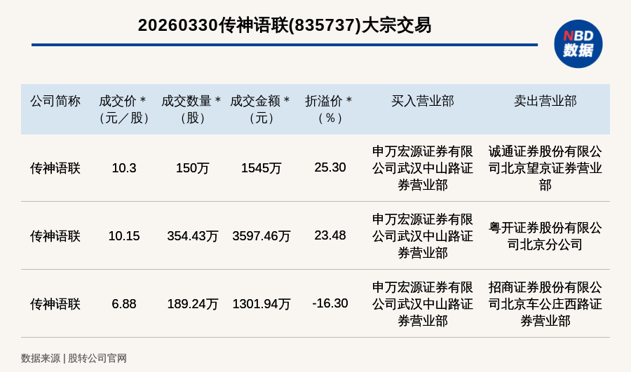 每经讯,2026年3月30日,新三板创新层公司传神语联(835737,收盘价:8.22元)发生3笔大宗交易,溢价率最高的一笔成交价10.3元/股,成交数量150万股,成交金额1545万元,溢价25.3%。买入营业部是申万宏源证券有限公司武汉中山路证券营业部,卖出营业部是诚通证券股份有限公司北京望京证券营业部。