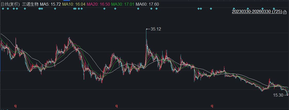 二级市场方面,公司股价自2024年10月8日盘中触及高点35.12元后持续震荡下行,今年3月27日公司发布新一轮回购方案当日,盘中创下近三年新低15.3元。据此计算,近三年三诺生物股价最大跌幅约56.44%。受上述回购利好提振,3月30日公司股价开盘涨幅超5%,随后冲高回落,最终报收16.14元,当日收涨2.54%,总市值90.43亿元。