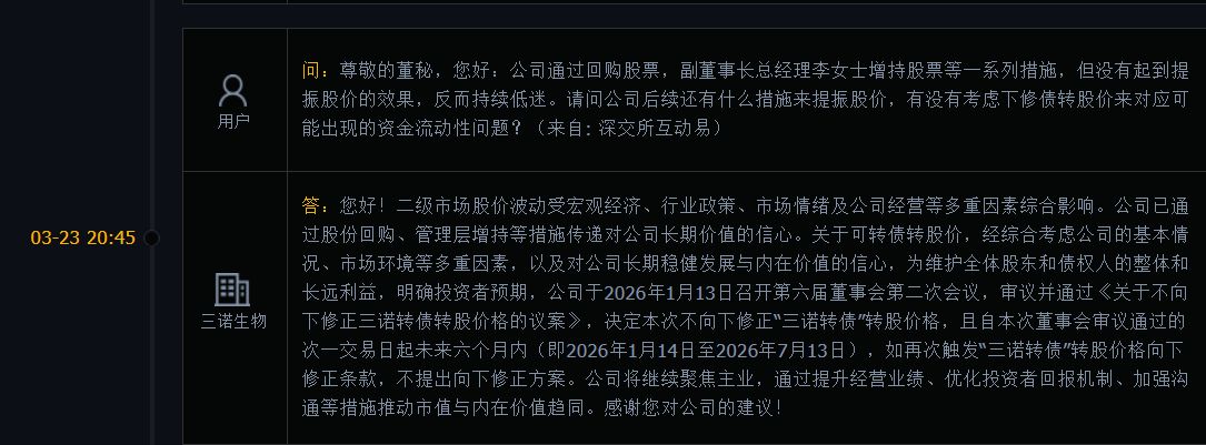 整体来看,面对股价持续下行和业绩下滑的双重压力,三诺生物通过连续回购注销叠加管理层增持的组合拳护盘。但在互动易平台,却有多位投资者提出相关疑问:公司推出多重稳股价措施,但目前股价仍未明显回暖,公司是否还有更系统、有力的市值管理举措?公司3月23日回复表示,二级市场股价波动受宏观经济、行业政策、市场情绪及公司经营等多重因素综合影响。公司已通过股份回购、管理层增持等措施传递对公司长期价值的信心。公司将继续聚焦主业,通过提升经营业绩、优化投资者回报机制、加强沟通等措施推动市值与内在价值趋同。