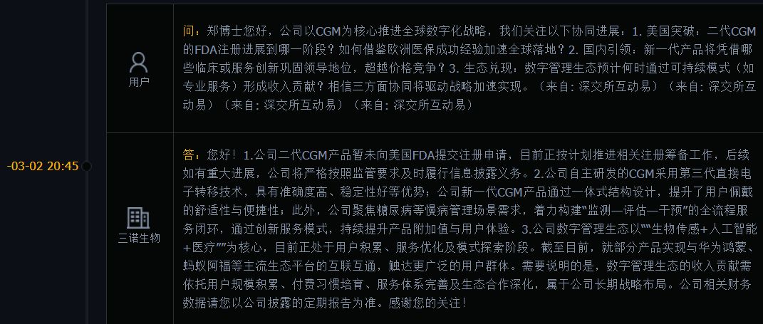 而对于公司以CGM为核心推进全球数字化战略,也有多位投资者提问何时能够形成收入贡献?公司3月2日回复称,公司数字管理生态以“生物传感+人工智能+医疗”为核心,目前正处于用户积累、服务优化及模式探索阶段。截至目前,就部分产品实现与华为鸿蒙、蚂蚁阿福等主流生态平台的互联互通,触达更广泛的用户群体。需要说明的是,数字管理生态的收入贡献需依托用户规模积累、付费习惯培育、服务体系完善及生态合作深化,属于公司长期战略布局。