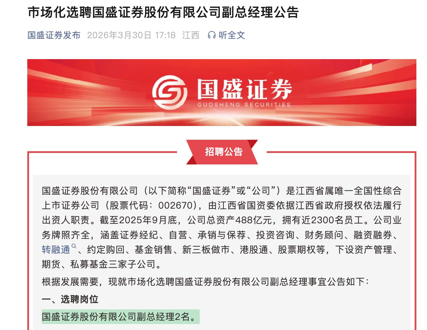 3月30日,国盛证券发布市场化选聘2名副总经理的公告,要求候选人具备10年以上金融行业工作经历及相关业务管理经验。