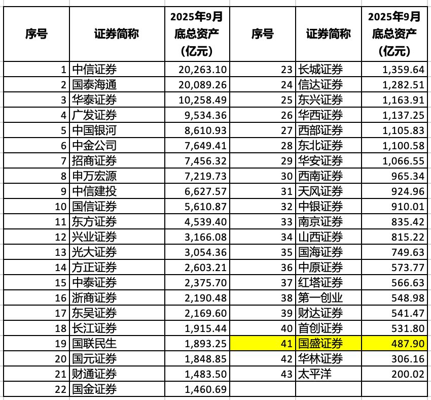 从目前的体量来看,截至2025年9月底,国盛证券总资产为488亿元,拥有近2300名员工。Wind数据显示,在43家上市券商中,国盛证券总资产居于第41位,仅有华林证券、太平洋证券总资产低于国盛证券。