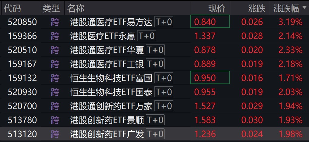 受盘面影响,港股医疗、恒生生物科技、港股创新药相关ETF涨约2%。