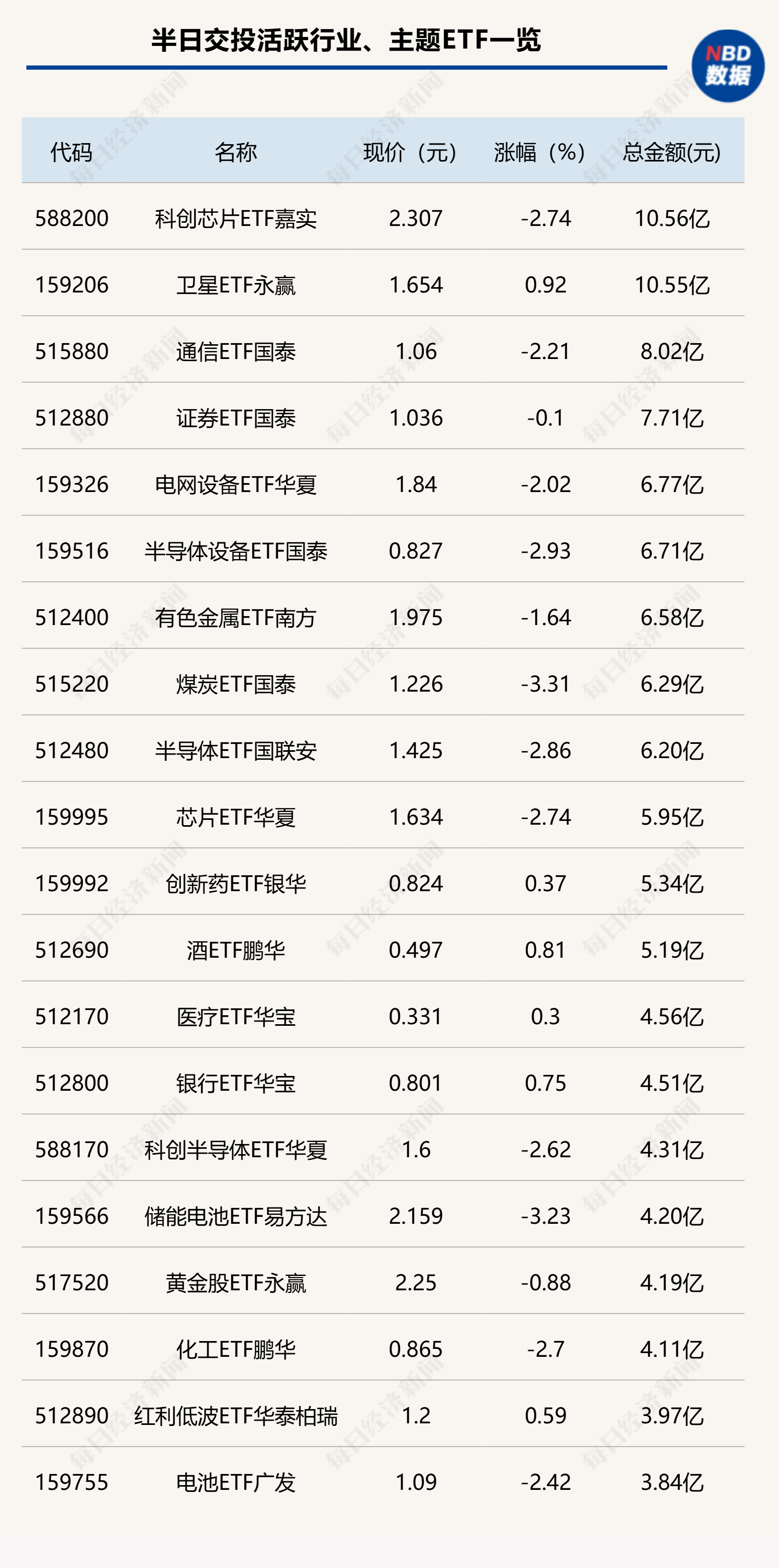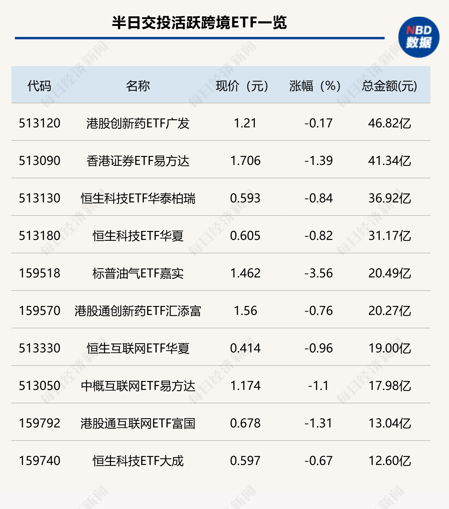 今日上午,行业、主题ETF交投依旧不活跃,仅科创芯片ETF嘉实(588200)和卫星ETF永赢(159206)半日成交金额超过10亿元;跨境ETF方面,港股创新药ETF广发(513120)和香港证券ETF易方达(513090)半日成交金额在40亿元以上。