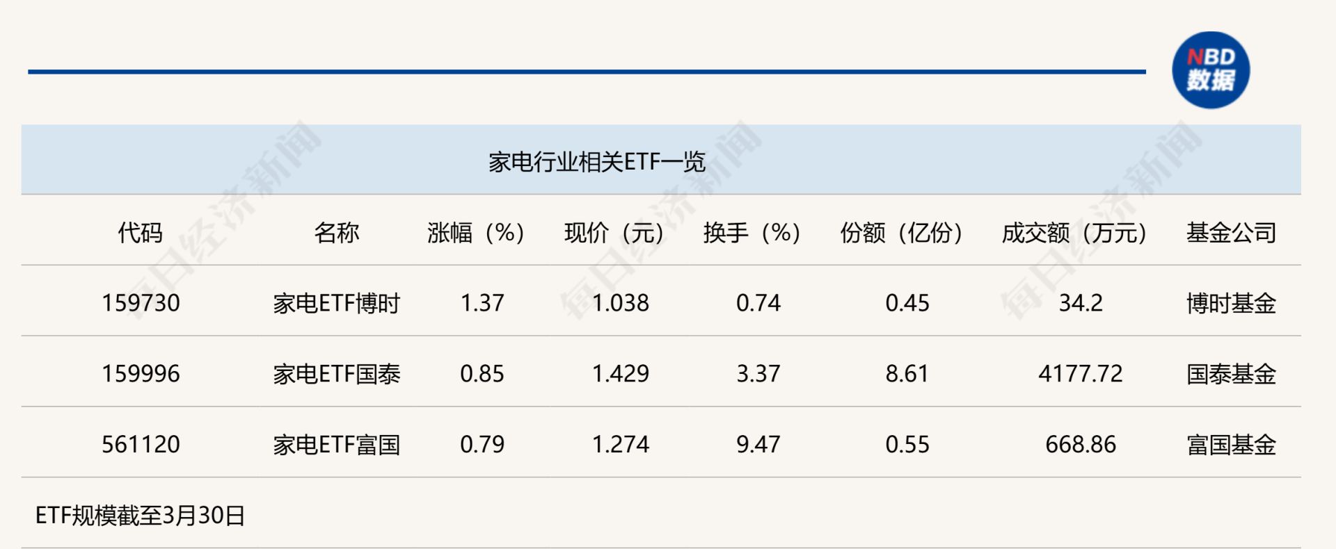 点评:家电ETF国泰(159996)和家电ETF富国(561120)今日上午涨幅接近1%,其中,家电ETF国泰(159996)规模较大,其份额达到8.61亿份,半日成交金额为4177.72万元。