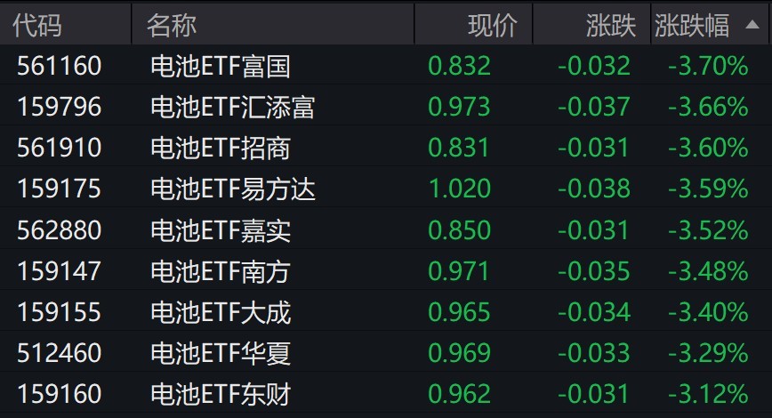 电池概念股午后持续走弱,亿纬锂能跌超10%,欣旺达跌超5%,天赐材料跌超4%。