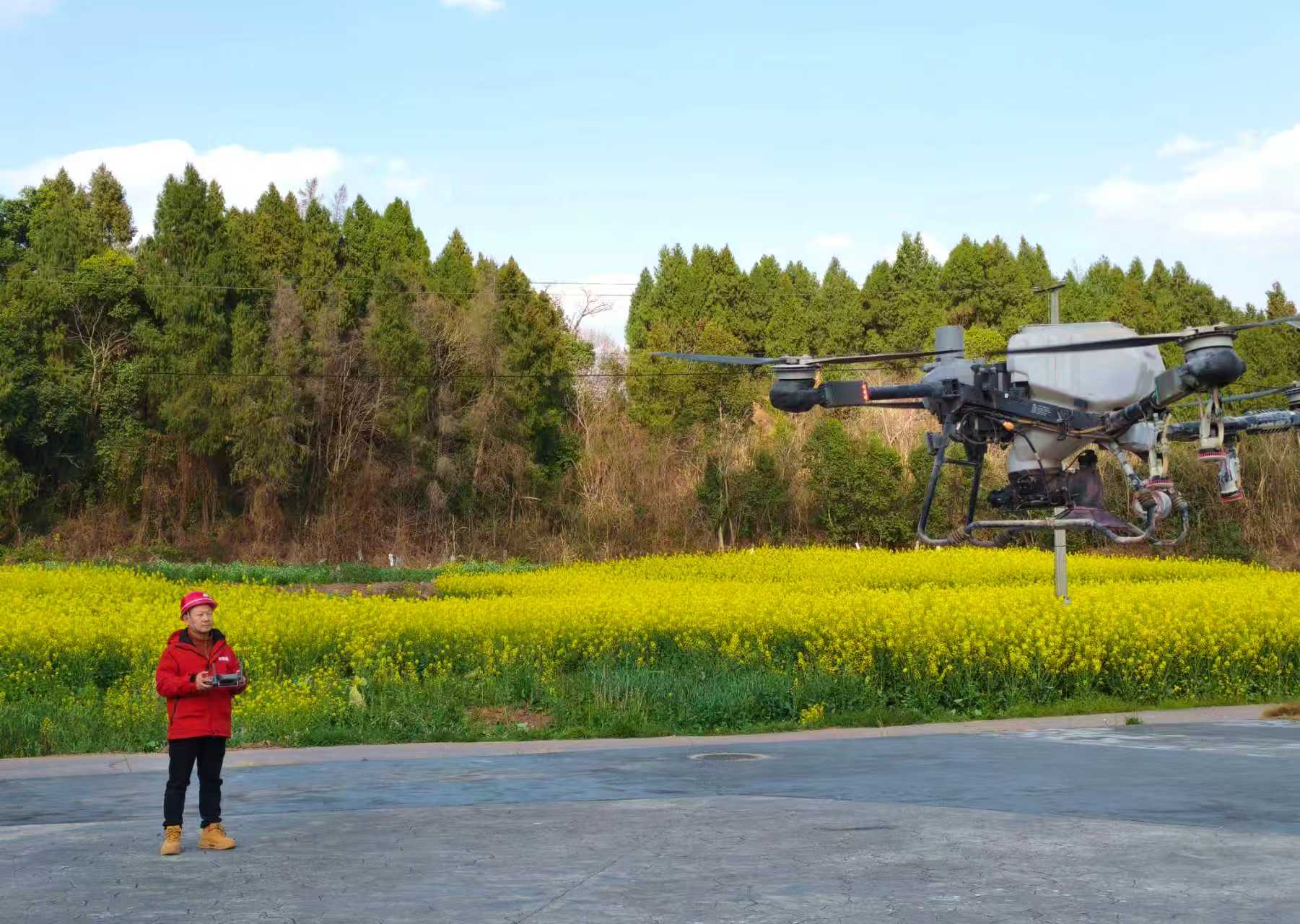 近日,在慈航镇观音社区小麦种植基地里,田埂上植保无人机依次升空,农机手熟练操控遥控器,无人机低空匀速飞行、均匀喷洒农药,高效又精准,勾勒出一派繁忙的春耕飞防景象。