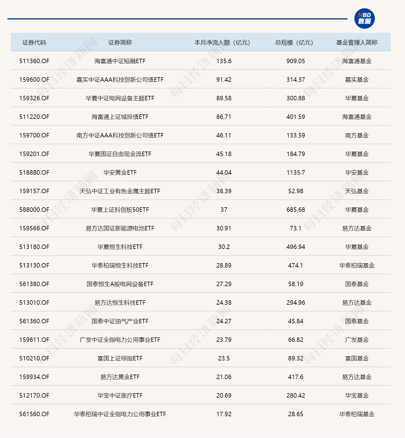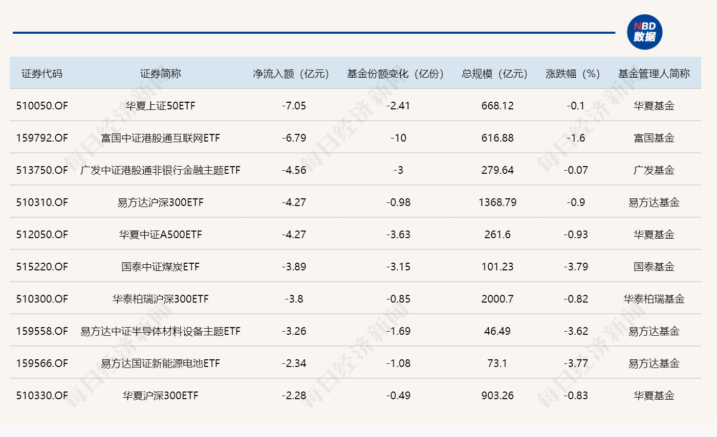 与此同时,华夏上证50ETF基金份额减少2.41亿份,净流出额7.05亿元;富国中证港股通互联网ETF基金份额减少10.00亿份,净流出额6.79亿元;广发中证港股通非银行金融主题ETF基金份额减少3.00亿份,净流出额4.56亿元。