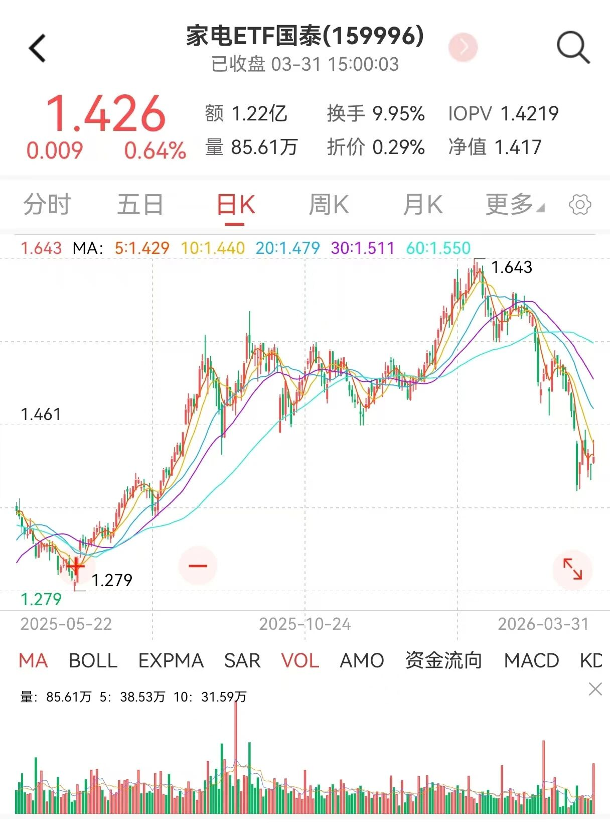 3月31日,家电ETF(159996)上涨0.64%。