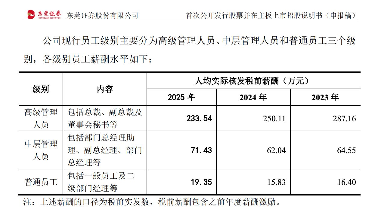 在东莞证券的招股说明书中,公司对各级别员工和各岗位员工薪酬水平予以详细披露。总体来看,2025年东莞证券平均薪酬为24.21万元,同比增长17.87%。