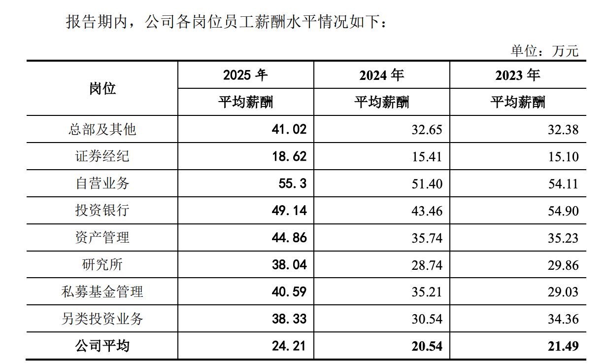 如果从平均薪酬的涨幅指标来看,研究部门人员涨幅最为亮眼。2025年东莞证券研究所人员平均薪酬38.04万元,同比增长32.36%,增长幅度最大。另外,总部及其他、资管和另类投资业务人员平均薪酬增幅均在25%左右;证券经纪业务人员平均薪酬涨幅也达到20.83%。