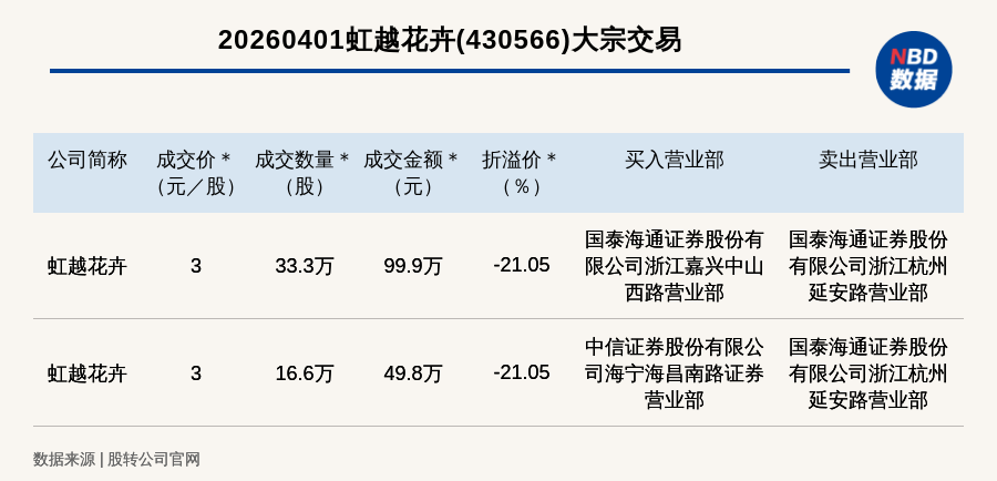 每经讯,2026年4月1日,新三板创新层公司虹越花卉(430566,收盘价:3.8元)发生2笔大宗交易,总成交金额为149.7万元,成交金额最高的一笔成交价3元/股,成交数量33.3万股,成交金额99.9万元,折价21.05%。买入营业部是国泰海通证券股份有限公司浙江嘉兴中山西路营业部,卖出营业部是国泰海通证券股份有限公司浙江杭州延安路营业部。